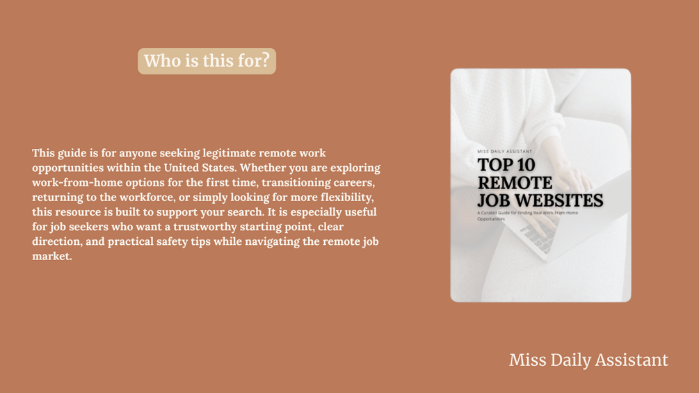 Inside, you’ll find a curated list of 10 reputable remote job websites known for screening listings, partnering with real companies, and maintaining strong credibility in the work-from-home space. Whether you’re looking for full-time, part-time, contract, or freelance opportunities, these platforms give you a safer, more focused starting point.