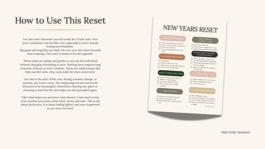Inside this download you will find a soft and supportive guide that walks you through how to use this reset, along with a clear checklist you can follow at your own pace. Each section focuses on tiny wins and small actions that make the new year feel lighter and more manageable.